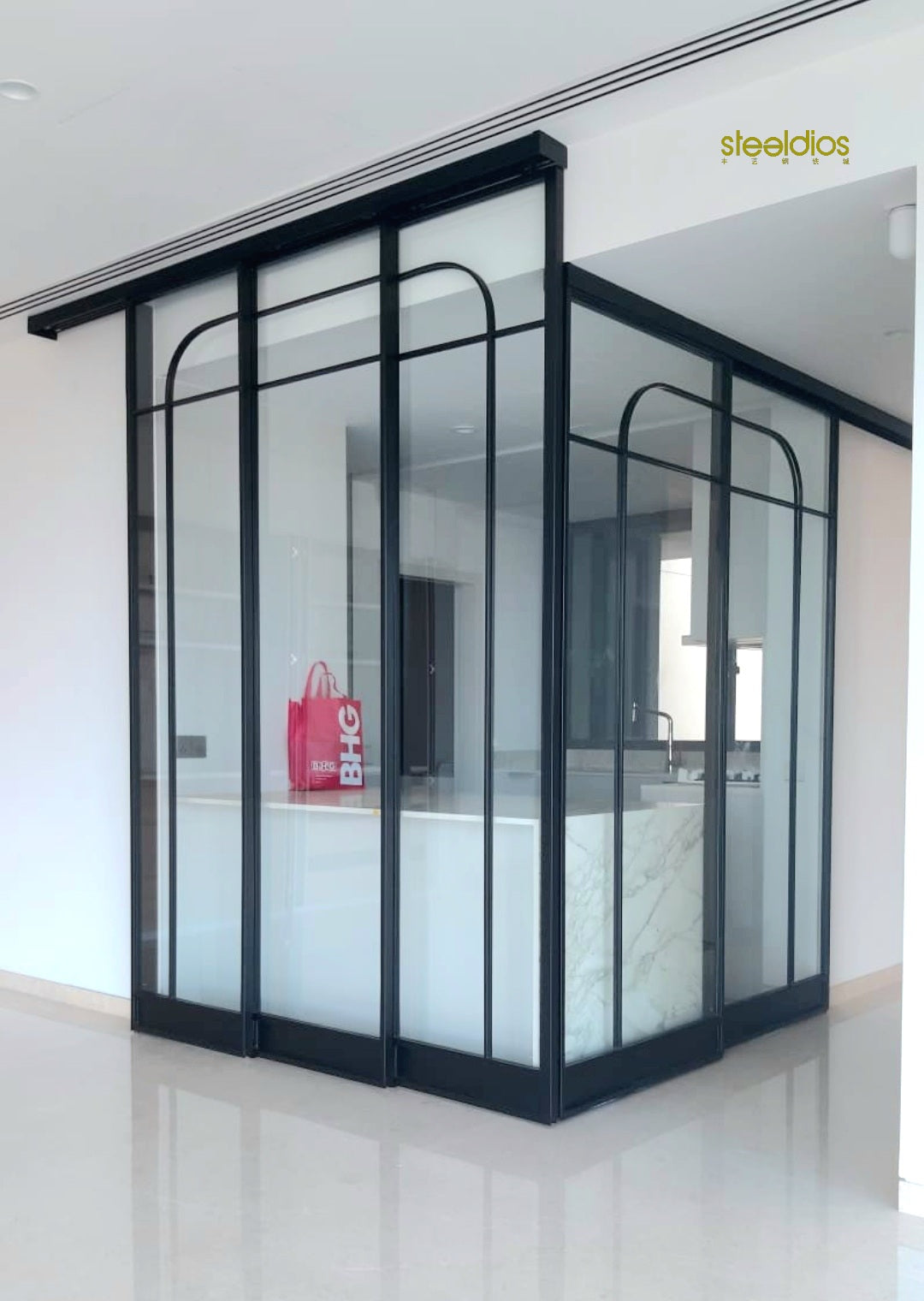 Crafted with durable tempered glass and robust mild steel frames, this design offers a perfect blend of functionality, openness, and modern aesthetics.